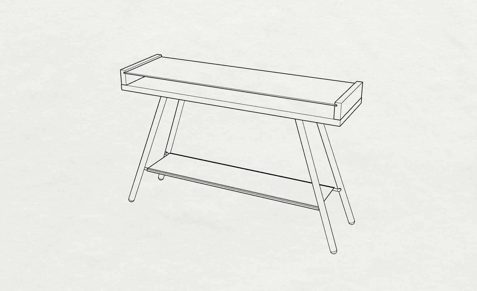 Mezcla la robustez de la madera natural y la transparencia y claridad del vidrio, articulando así un mueble ligero y muy funcional. Toda esta estructura es sostenida sobre un conjunto de patas de metal que rematan en unos soportes redondeados entregándole a la totalidad un carácter suave y acogedor.