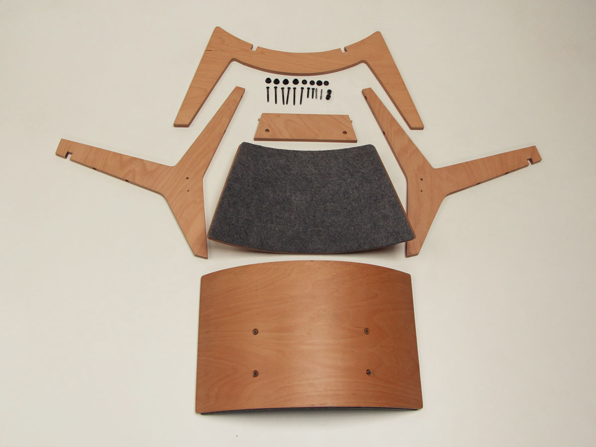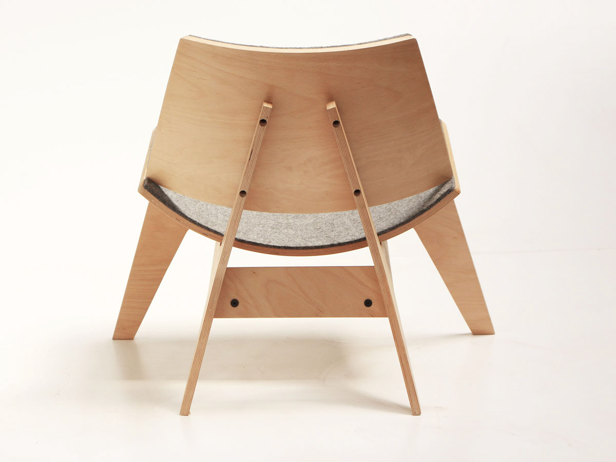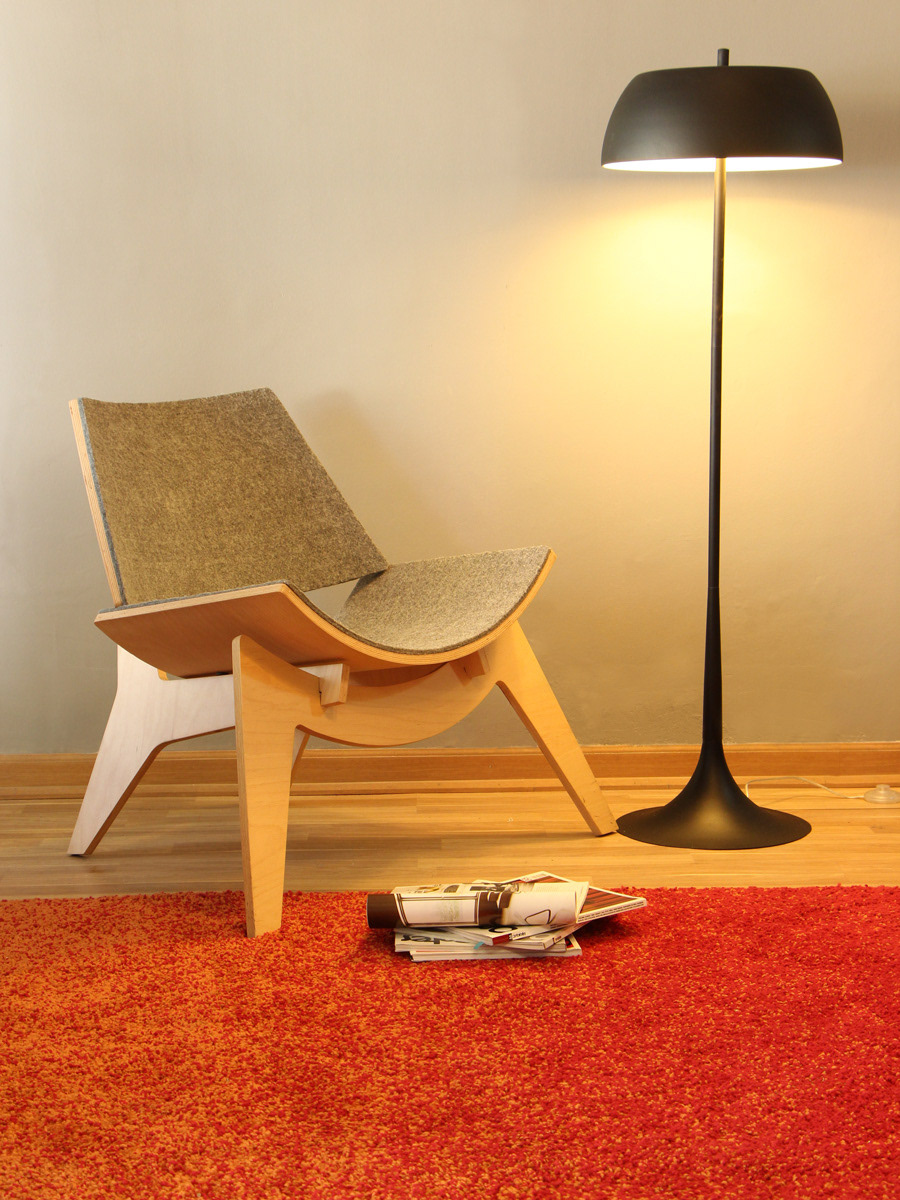 Pienso que descansar, al igual que trabajar es una de las cosas que mas vale la pena hacer en la vida por lo tanto he pensado esta silla para que puedas descansar en una posición baja y cómoda mientras descansas o lees un libro. Mi idea fue que la silla es algo que debería acogerte e invitarte a sentar. En esta misma idea de la contención aparecen conceptos como nuestro planeta tierra que nos contiene a todos es por eso que le puse como el nombre de la diosa griega de la tierra Gaia. Otro gesto en el que pensé al contener es cuando curvamos ambas manos para tomar agua de ahí un poco aparece esta morfología curva para las piezas fundamentales que acogen al cuerpo -asiento y respaldo- los que son soportados por otras piezas rectas a modo de costillas. Silla es desarmable y está fabricada con madera laminada de haya y fieltro industrial.