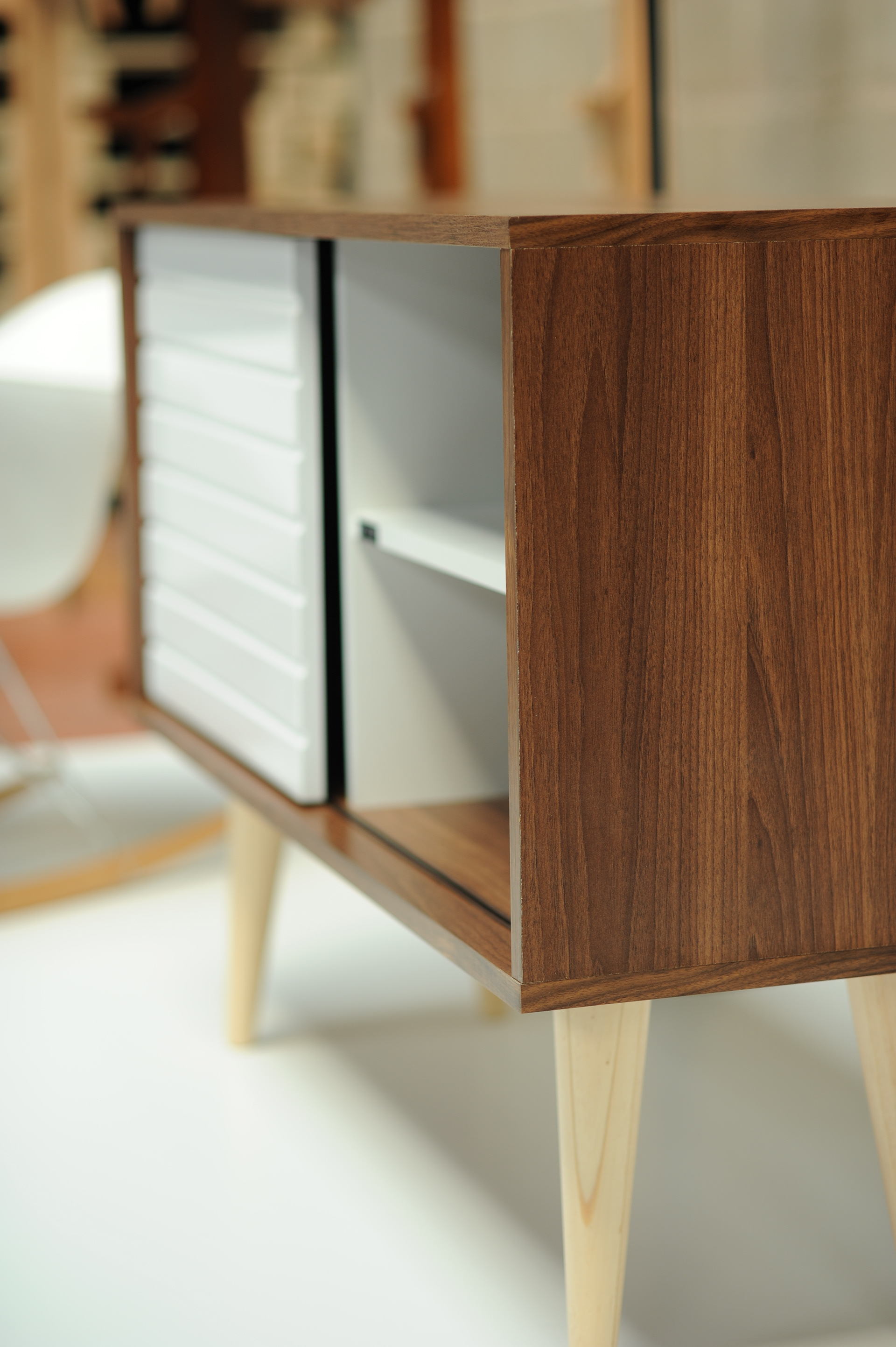 El rack Stop esta inspirado en los muebles antiguos de mitad del siglo 20, incorpora patas en estilo supersonico y ademas tiene madera nogal y puerta termolaminada